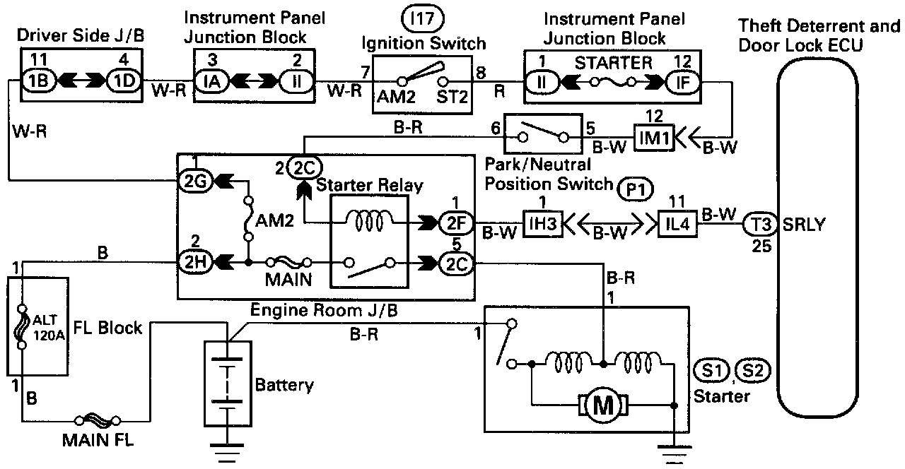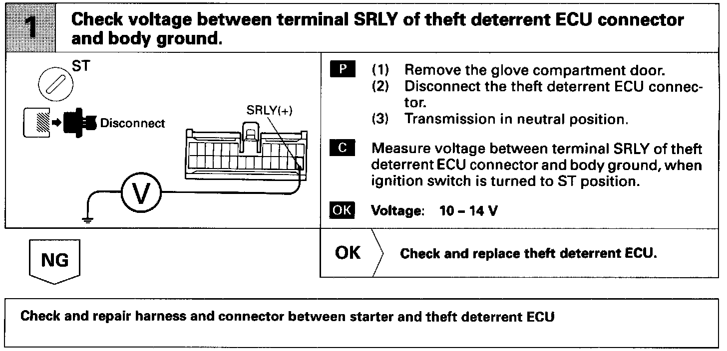 When the theft deterrent system is activated, contact (a) in the ECU becomes open, creating an open circuit in terminal SRLY circuit and making the starter inoperative (starter cut).
