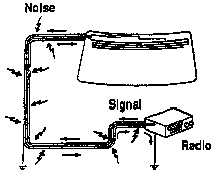 Electronic signal received by the antenna reaches the radio through the core wire of the coaxial cable. Any noise mixed into this wire will cause noise in the radio. In order to prevent this noise from mixing into the radio, the core wire inside the coaxial cable is covered with a mesh wire called a shield wire. This shield insulates against noise by transmitting noise to ground (through the case of the radio). If this shield wire has a poor ground, noise may result.