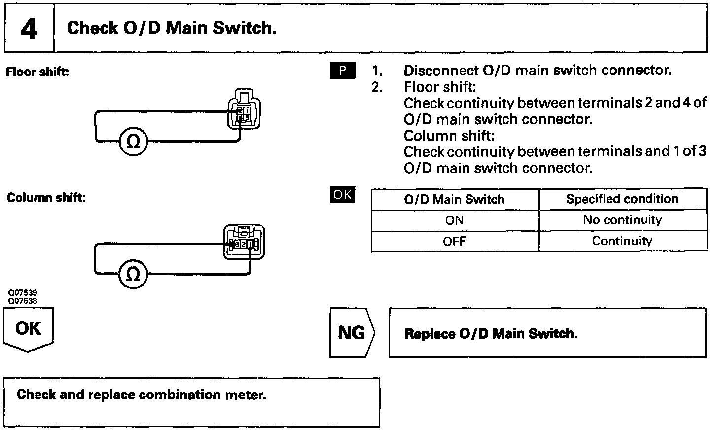 The O/D main switch contacts go off when the switch is pushed in and come on when it is pushed out. In O/D main switch OFF position, the O/D OFF indicator lights up and the ECM prohibits shifting to O/D.