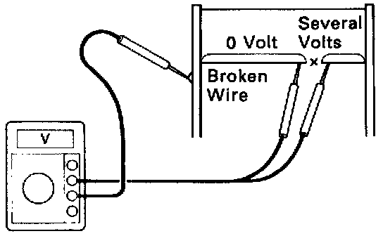 HINT: If there is approximately 10 V, the wire is broken between the center of the wire and the positive (+) end. If there is no voltage. the wire is broken between the center of the wire and ground.