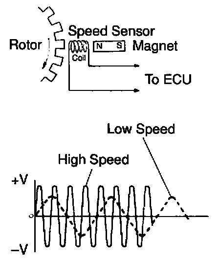 When the rotors rotate, the magnetic field emitted by the permanent magnet in the speed sensor generates an AC voltage. Since the frequency of this AC voltage changes in direct proportion to the speed of the rotor, the frequency is used by the ECU to detect the speed of each wheel.