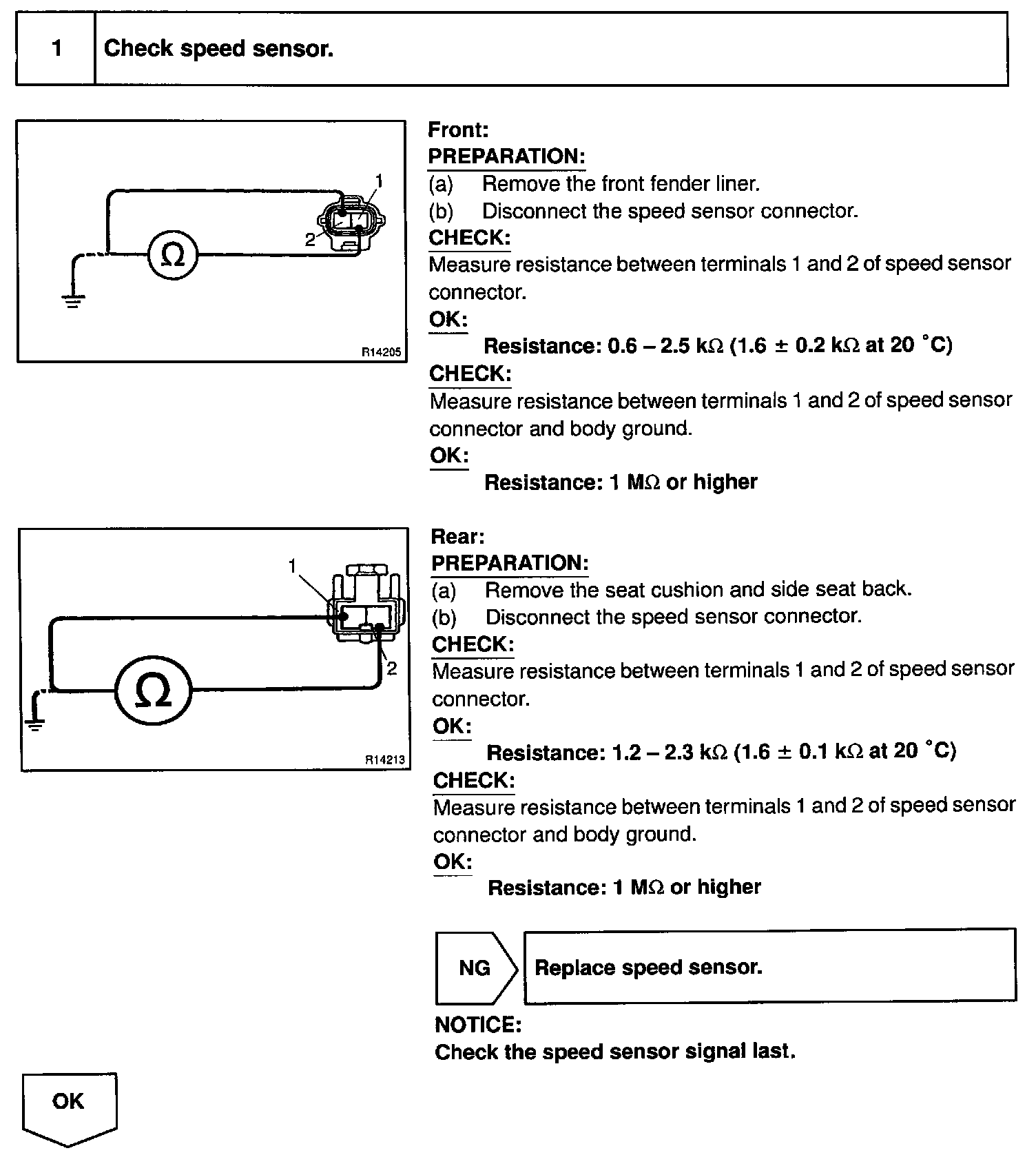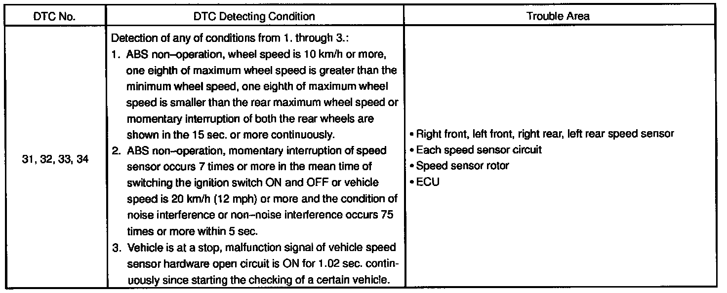 If trouble occurs in the speed sensor circuit, the ECU cuts off current to the ABS & TRAC solenoid relay and prohibits ABS control and TRAC control.