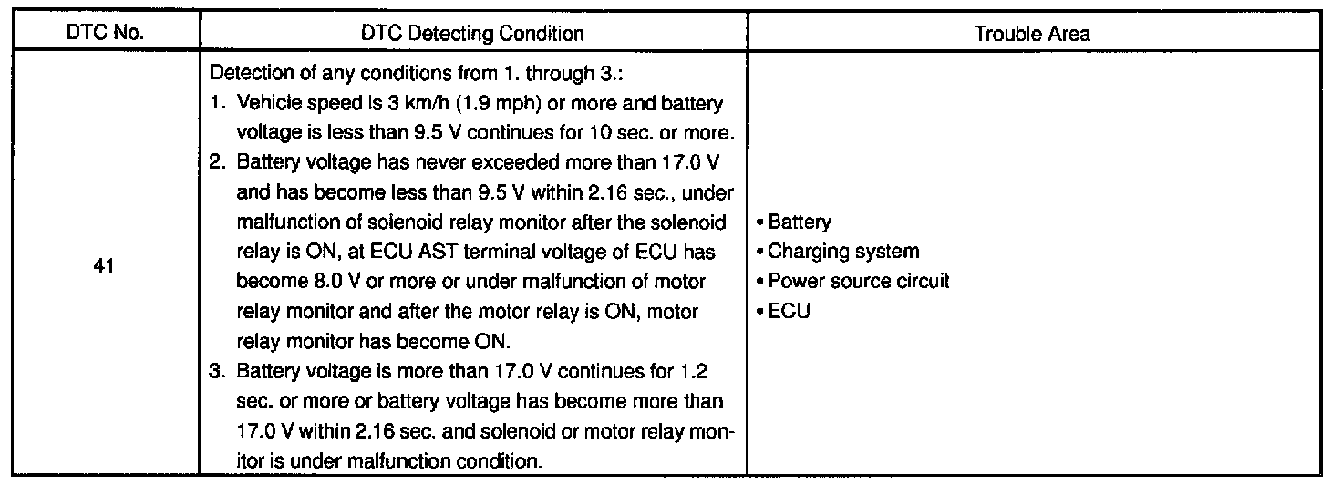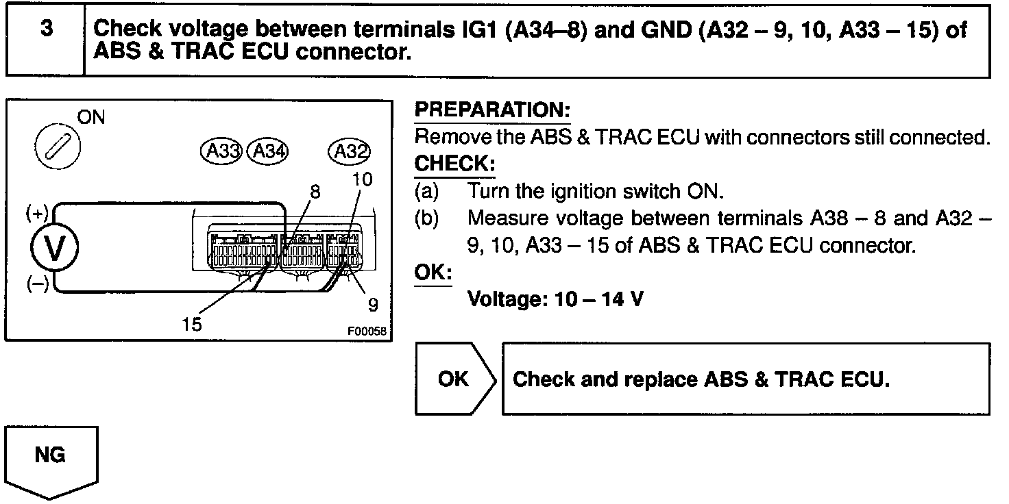 If any trouble occurs in the power source circuit, the ECU cuts off current to the ABS & TRAC solenoid relay and prohibits ABS control and TRAC control.