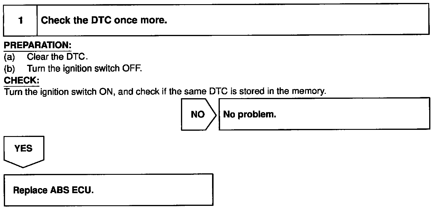 If trouble occurs in the actuator solenoid valve circuit, the ECU cuts off current to the ABS solenoid valve relay and prohibits ABS control.