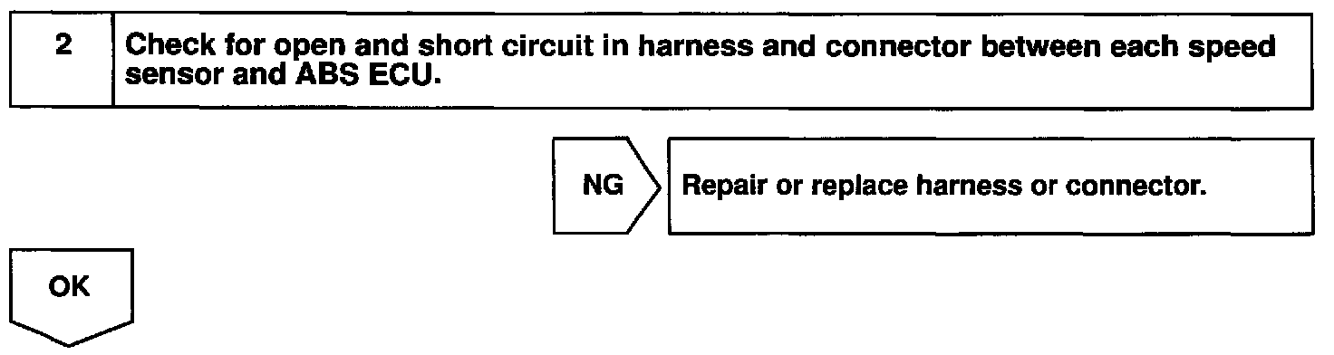 If trouble occurs in the speed sensor circuit, the ECU cuts off current to the ABS solenoid valve relay and prohibits ABS control.