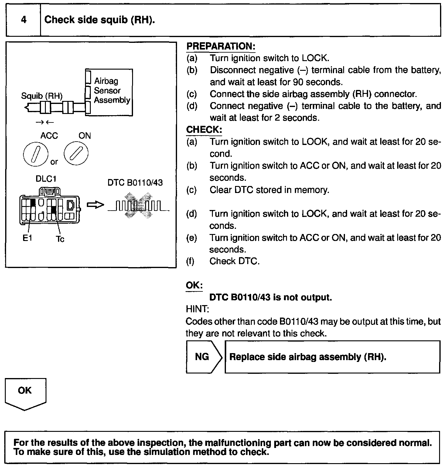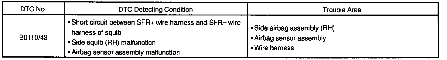 DTC B0110/43 is recorded when a short is detected in the side squib (RH) circuit.