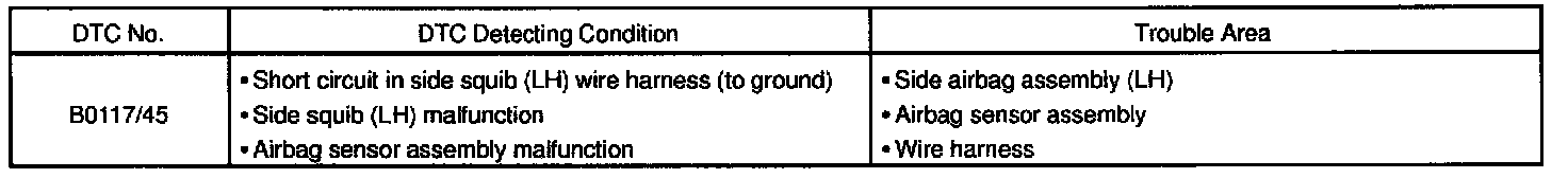 DTC B0117/45 is recorded when ground short is detected in the side squib (LH) circuit.