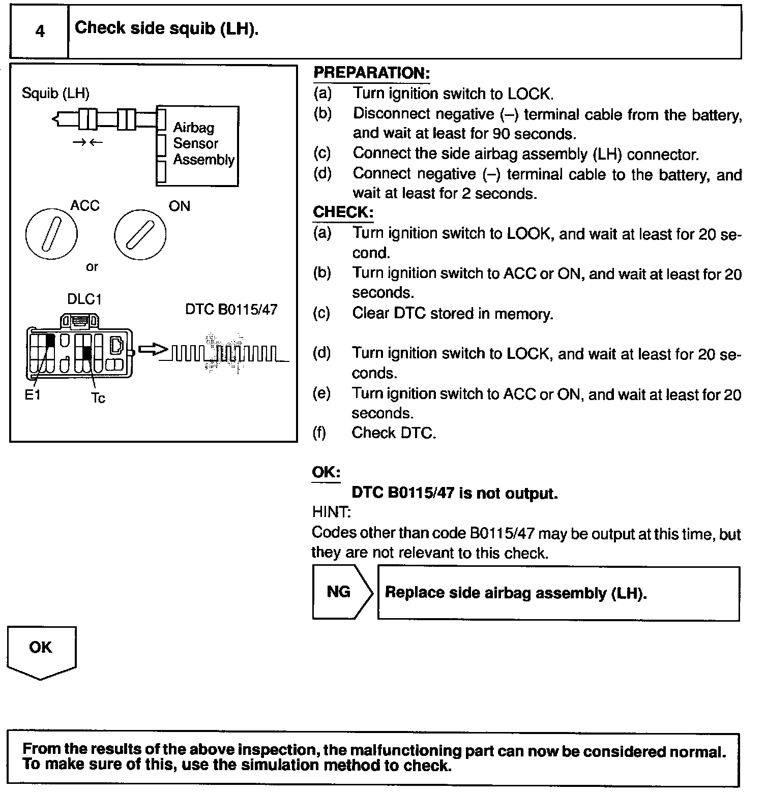 DTC B0115/47 is recorded when a short is detected in the side squib (LH) circuit.