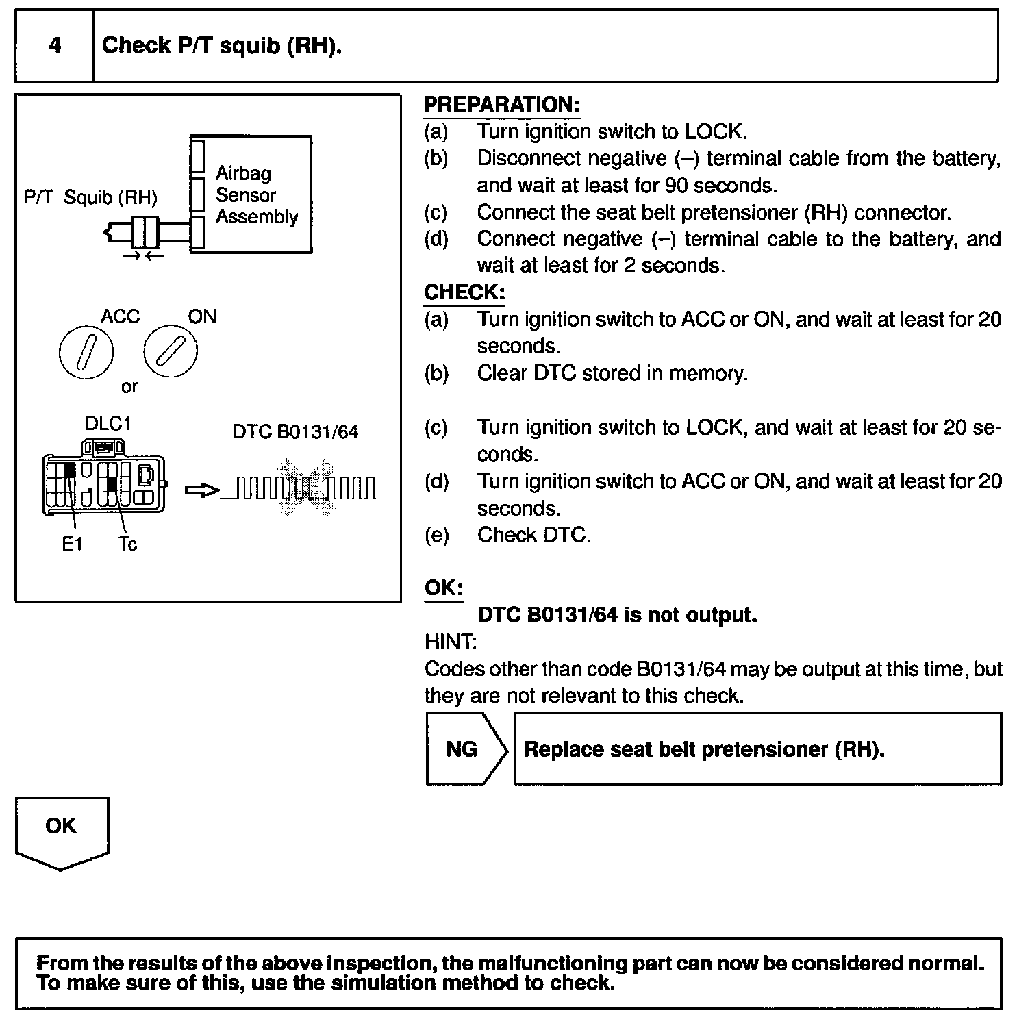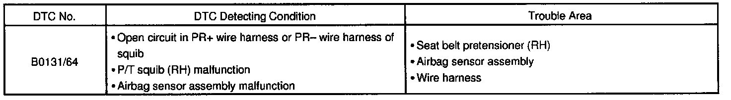 DTC B0131/64 is recorded when an open is detected in the P/T squib (RH) circuit.