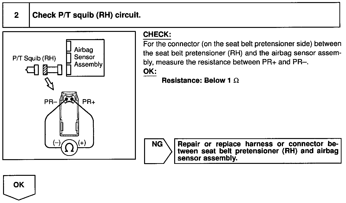 The P/T squib circuit (RH) consists of the airbag sensor assembly and seat belt pretensioner (RH).
