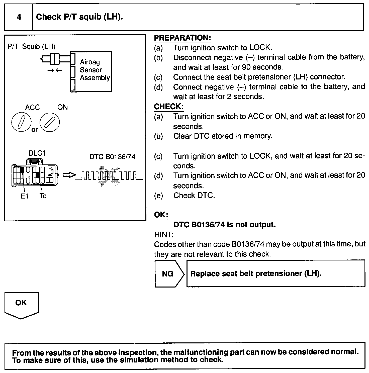 DTC B0136/74 is recorded when an open is detected in the P/T squib (LH) circuit.