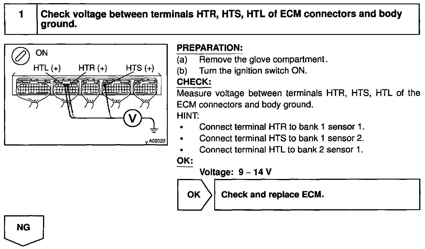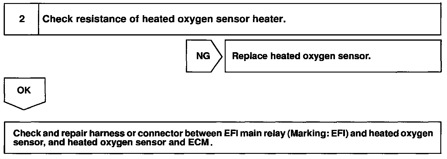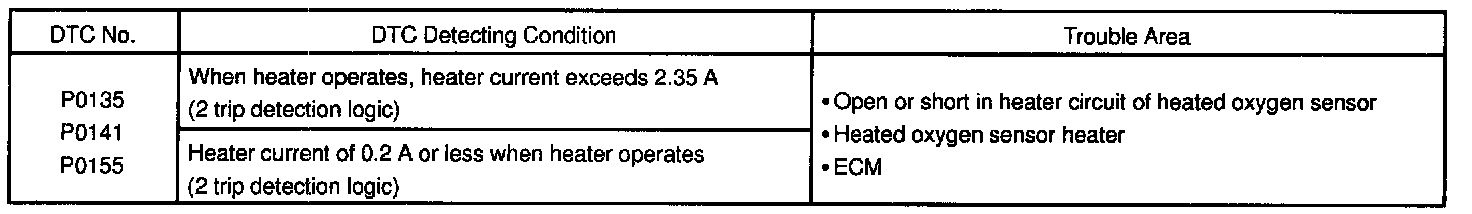 The heated oxygen sensors include a heater which heats the zirconia element. The heater is controlled by the ECM. When the intake air volume is low (the temperature of the exhaust gas is low) current flows to the heater to heat the sensor for accurate oxygen concentration detection.