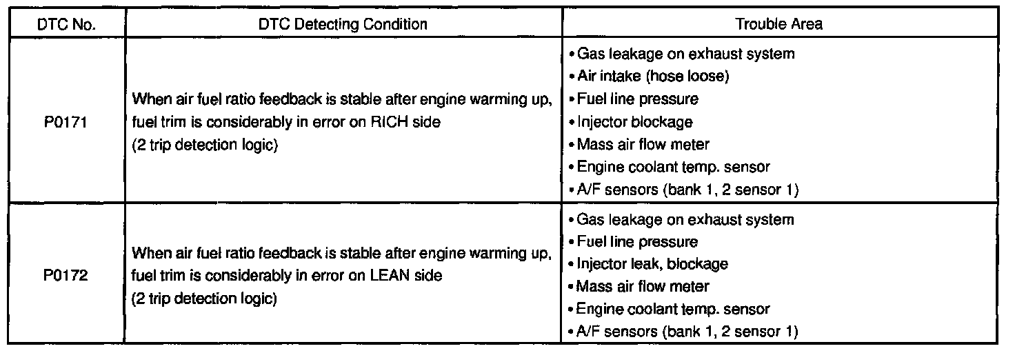- When the DTC P0171 is recorded, the actual air-fuel ratio is on the lean side. When DTC P0172 is recorded, the actual air-fuel ratio is on the rich side.