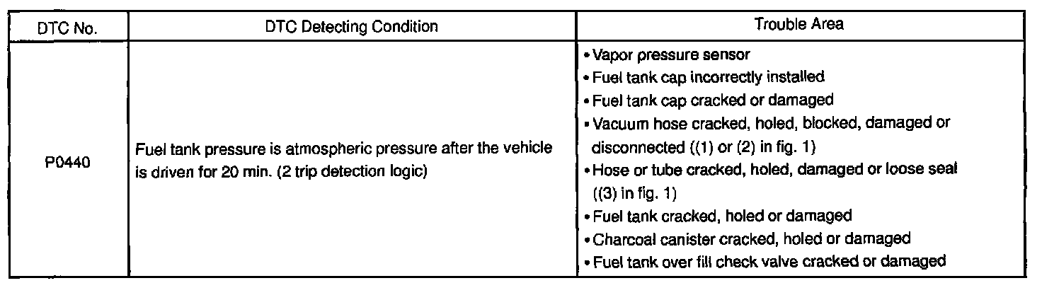 DTC P0440 is recorded by the ECM when evaporative emissions leak from the components within the dotted line in fig. 1, or when the vapor pressure sensor malfunctions.
