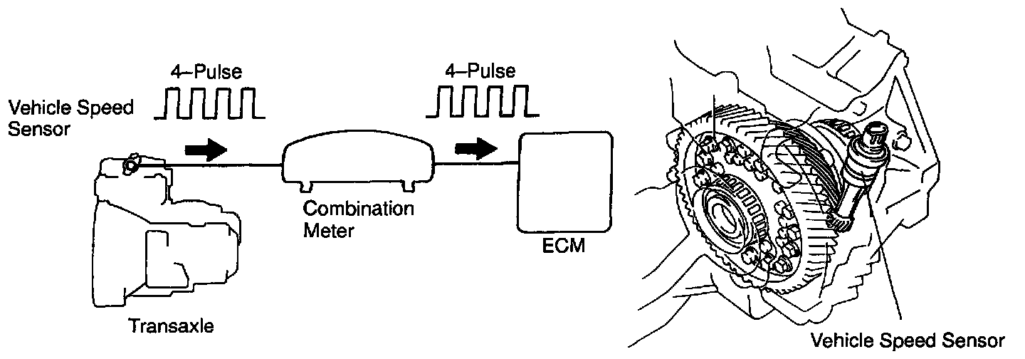The vehicle speed sensor outputs a 4-pulse signal for every revolution of the rotor shaft, which is rotated by the transmission output shaft via the driven gear. After this signal is converted into a more precise rectangular waveform by the waveform shaping circuit inside the combination meter, it is then transmitted to the ECM. The ECM determines the vehicle speed based on the frequency of these pulse signals.