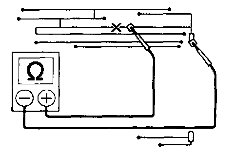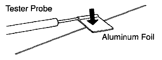 NOTE: In order not to damage the glass printed antenna, wrap up the tip of the tester stick with aluminum foil as shown in the illustration and check by holding the aluminum foil with a finger.