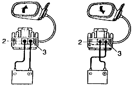 c. Connect the positive (+) lead from the battery to terminal 1 and negative (-) lead to terminal 2, check that the mirror turns left side.