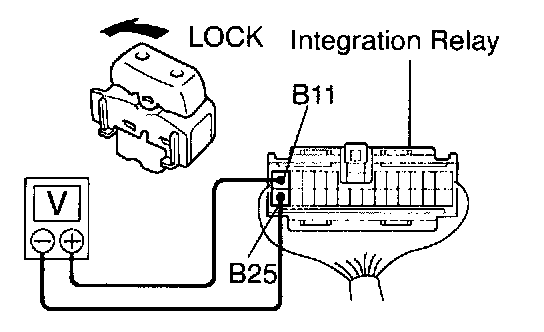 b. Set the door lock control switch to LOCK and check that the voltage rises from 0 V to battery positive voltage for approximately 0.2 seconds.