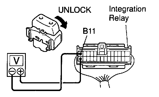 d. Set the door lock control switch to UNLOCK and check that the voltage rises from 0 V to battery positive voltage for approximately 0.2 seconds.