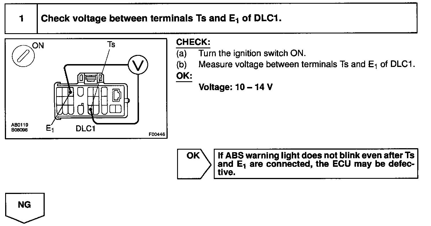 Connecting terminals Ts and E1 of the DLC1 in the engine compartment starts the check.