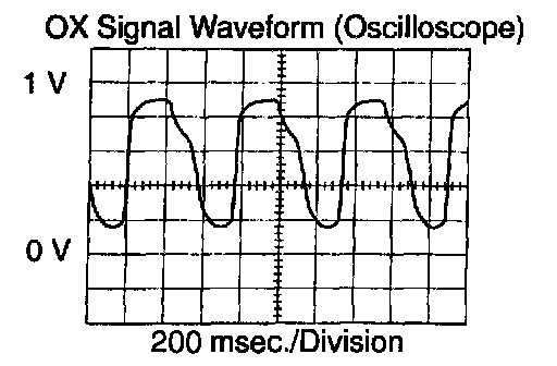 HINT: If there is a malfunction in the system, the waveform of the heated oxygen sensor, bank 1 sensor 2 (OXS), is almost the same as that of the heated oxygen sensor, bank 1 sensor 1 (OX1), on the left.