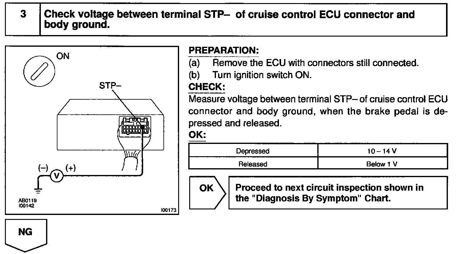 When the brake is ON, battery positive voltage normally is applied through the STOP fuse and stop light switch to terminal STP- of the ECU, and the ECU turns the cruise control OFF.