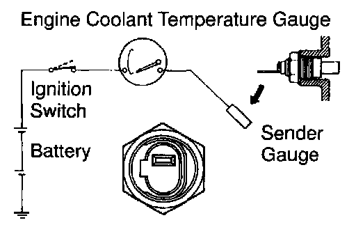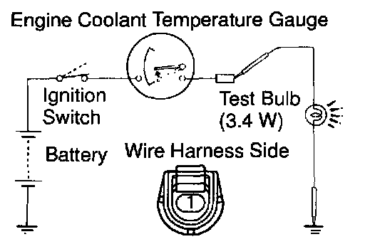 d. Turn the ignition switch ON, check that the bulb lights up and the receiver gauge needle moves toward the hot side.