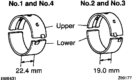 ^ Main bearings come in widths of 19.0 mm (0.748 inch) and 22.4 mm (0.882 inch). Install the 22.4 mm (0.882 inch) bearings in the No.1 and No.4 cylinder block journal positions with the main bearing cap. Install the 19.0 mm (0.748 inch) bearings in the No.2 and No.3 positions.