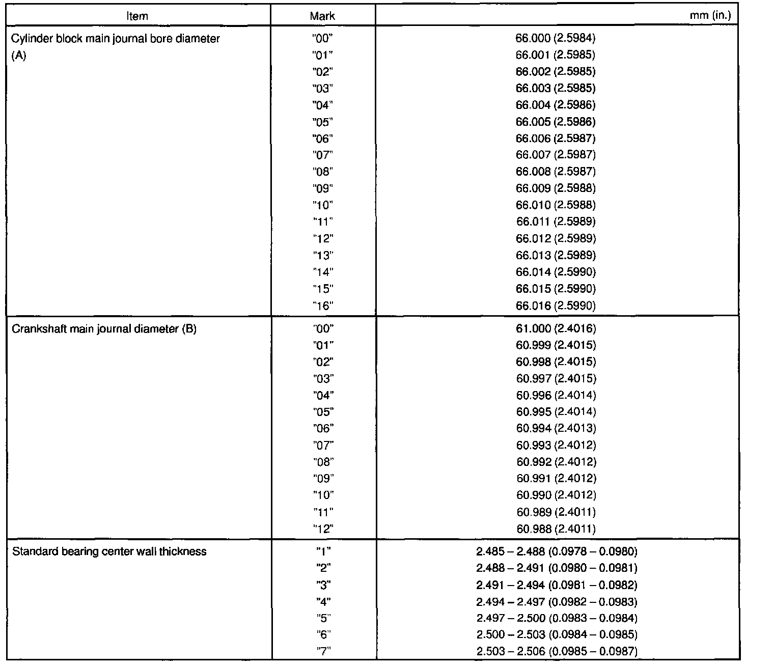 HINT: If using a bearing, replace it with one having the same number. If the number of the bearing cannot be determined, select the correct bearing by adding together the numbers imprinted on the cylinder block and crankshaft, then refer to the table below for the appropriate bearing number. The No.1 and No.4 journal bearings have 5 standard bearing sizes, marked "3", "4", "5", "6" and "7" accordingly. The No.2 and No.3 journal bearings have 5 standard bearing sizes, marked "1", "2", "3", "4" and "5" accordingly.