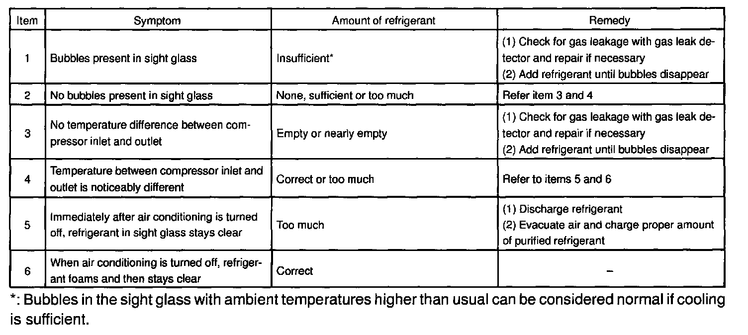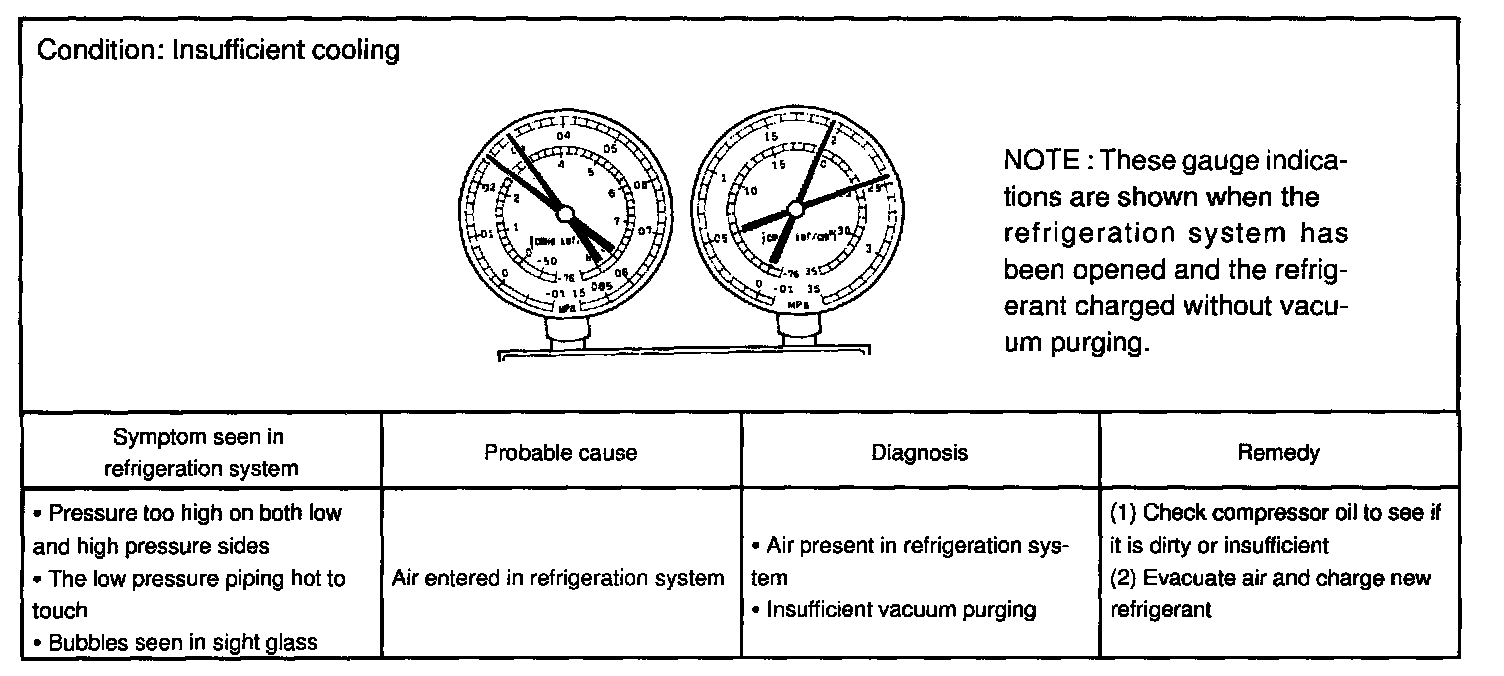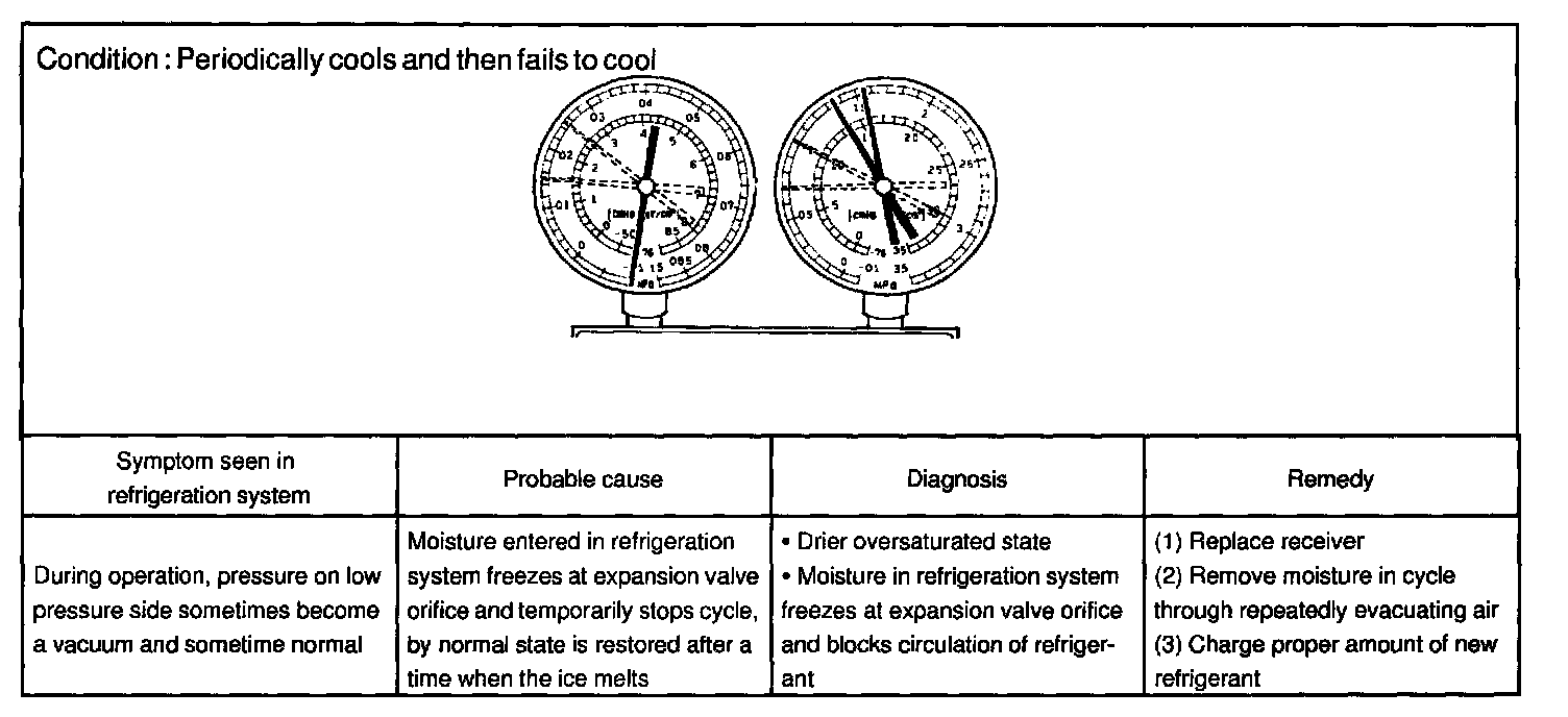 This is a method in which the trouble is located by using a manifold gauge set. Read the manifold gauge pressure when the these conditions are established.
