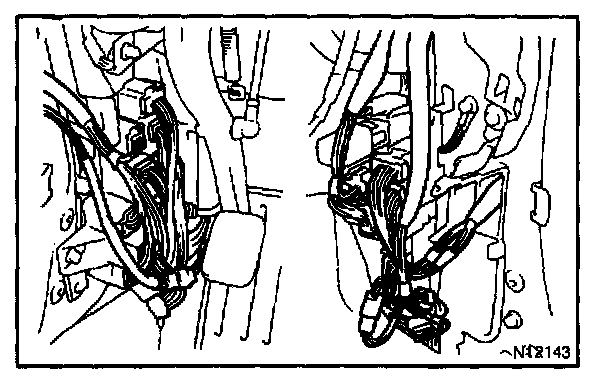 - When installing the front passenger airbag assembly, take care that the wiring does not interfere with other parts and is not pinched between other parts.