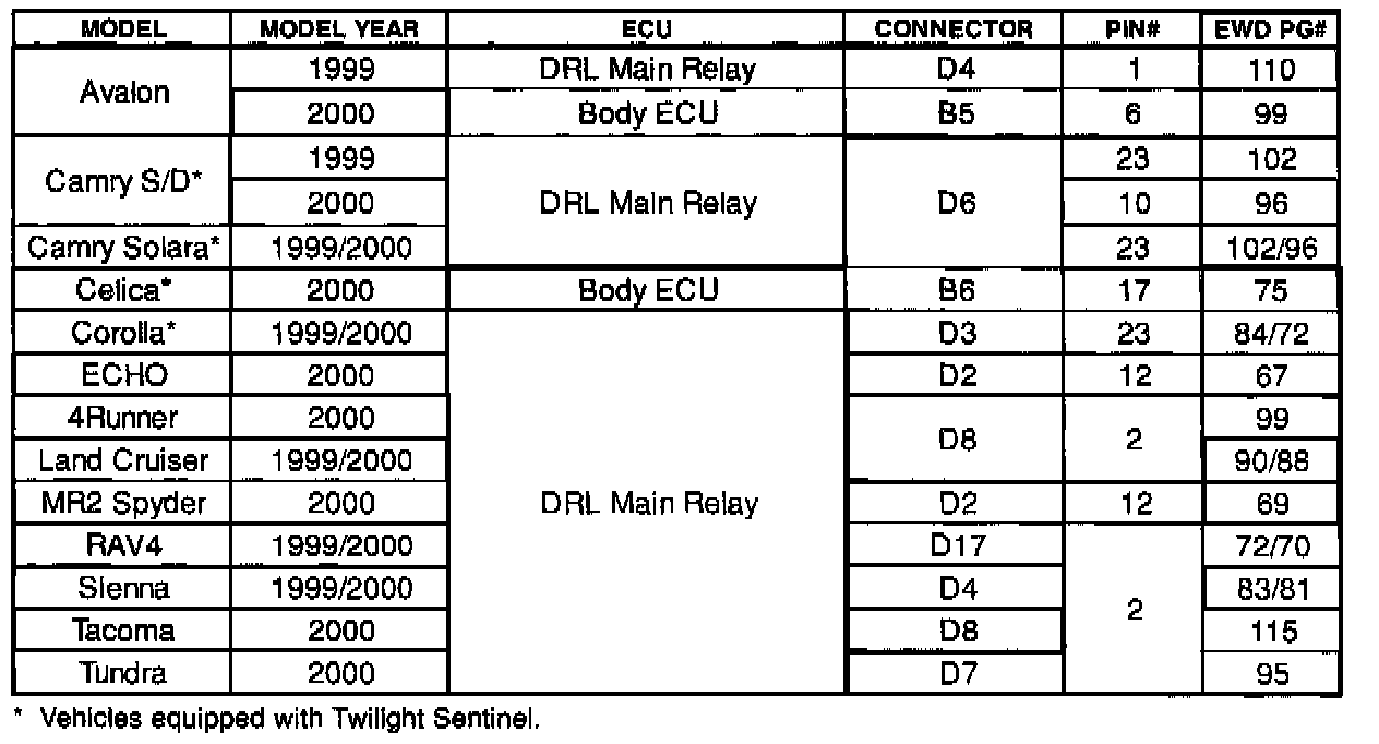 Please be sure the customer is informed that when the Daytime Running Lights (DRL) are being disabled, although it is not required by the Federal Motor Vehicle Safety Standards for safety compliance, it has been listed as a safety feature in advertising brochures. In addition, on models equipped with the Twilight Sentinel feature, the headlights will be defaulted to a manual system and will no longer function automatically.