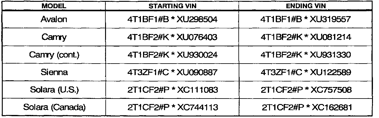 1999 CA Emission Spec. TMMK produced Avalon, Camry (1MZ-FE), Sienna & TMMC produced Solara (1MZ-FE) vehicles built between the VIN numbers listed below.