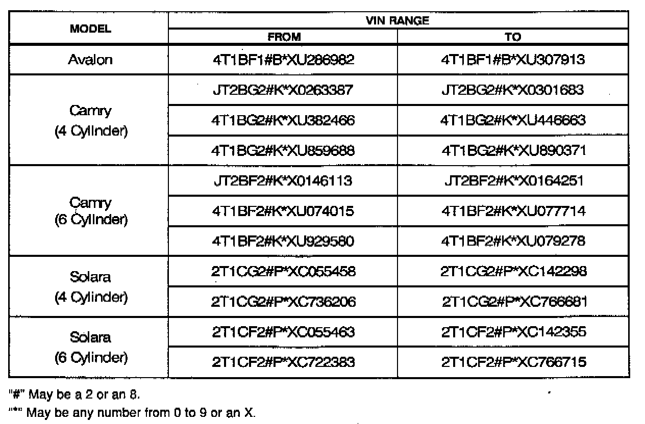 Under certain driving conditions, some 1999 Model Year Avalon, Camry and Solaras will exhibit a false M.I.L. "ON" DTC P0446. A Vacuum Control Valve Assembly has been developed to prevent this condition.