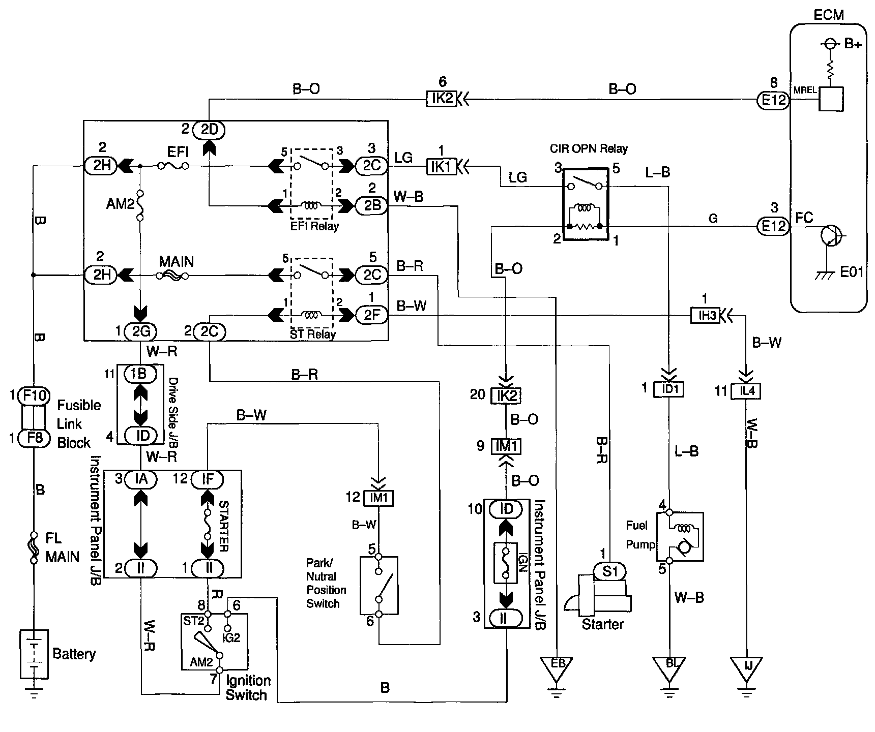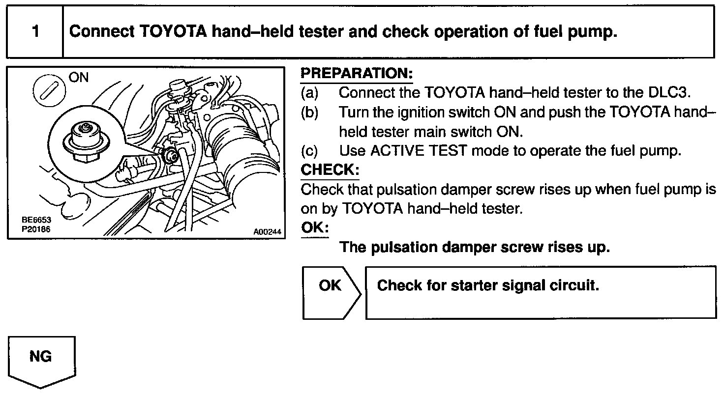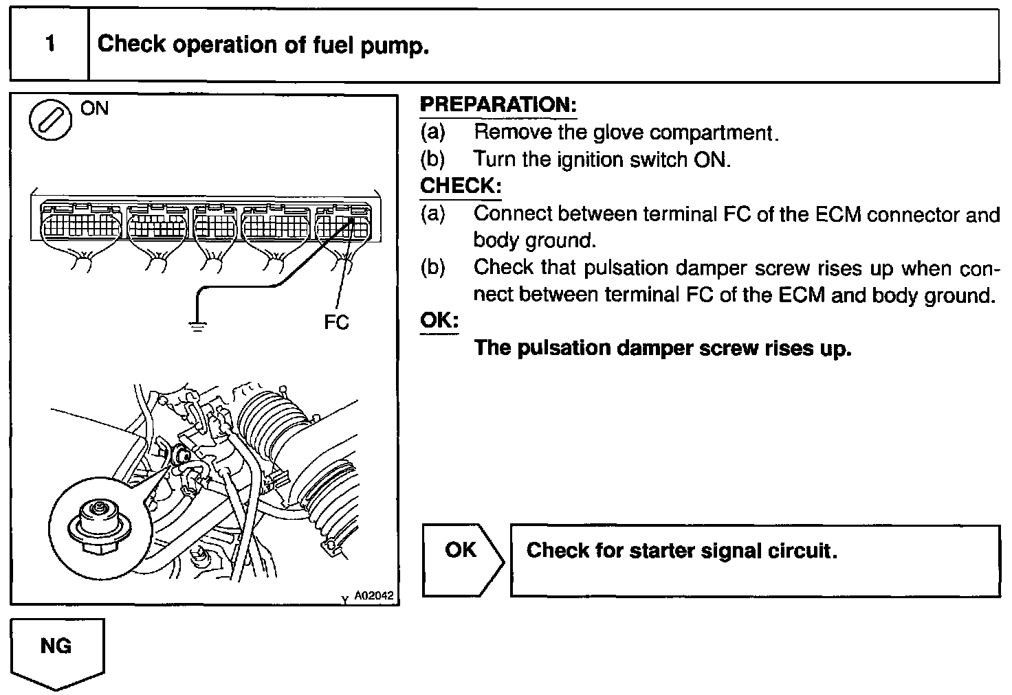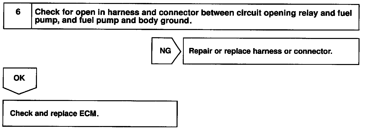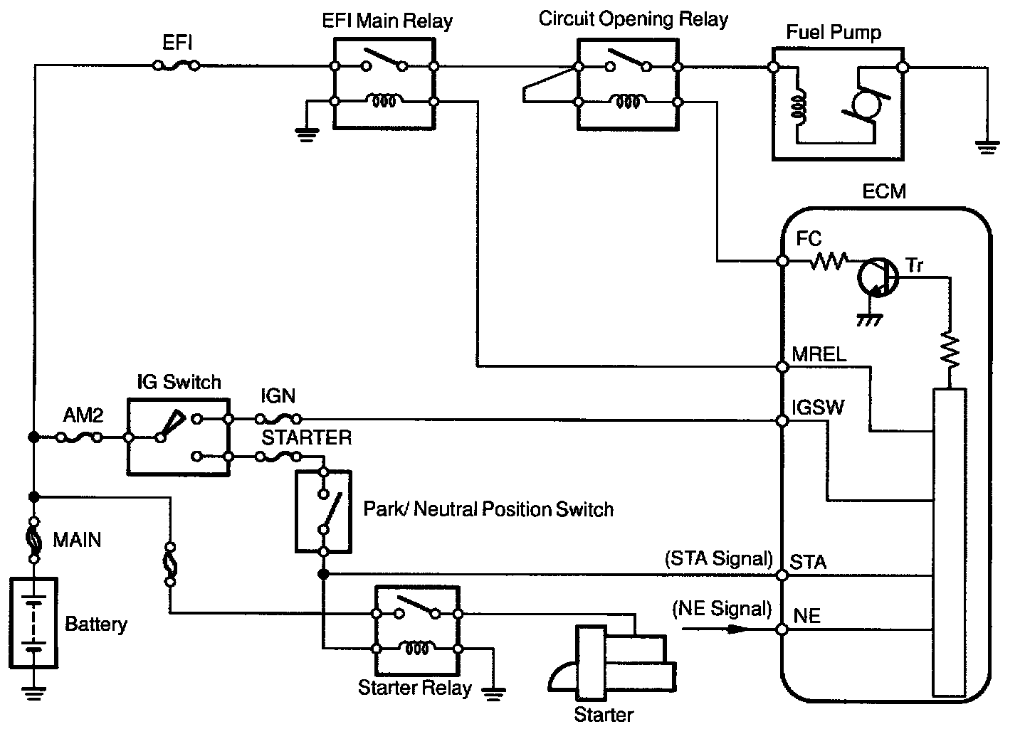When the STA signal and NE signal are input to the ECM, Tr is turned ON, current flows to coil of the circuit opening relay, the relay switches on, power is supplied to the fuel pump and the fuel pump operates. While the NE signal is generated (engine running), the ECM keeps Tr ON (circuit opening relay ON) and the fuel pump also keeps operating.