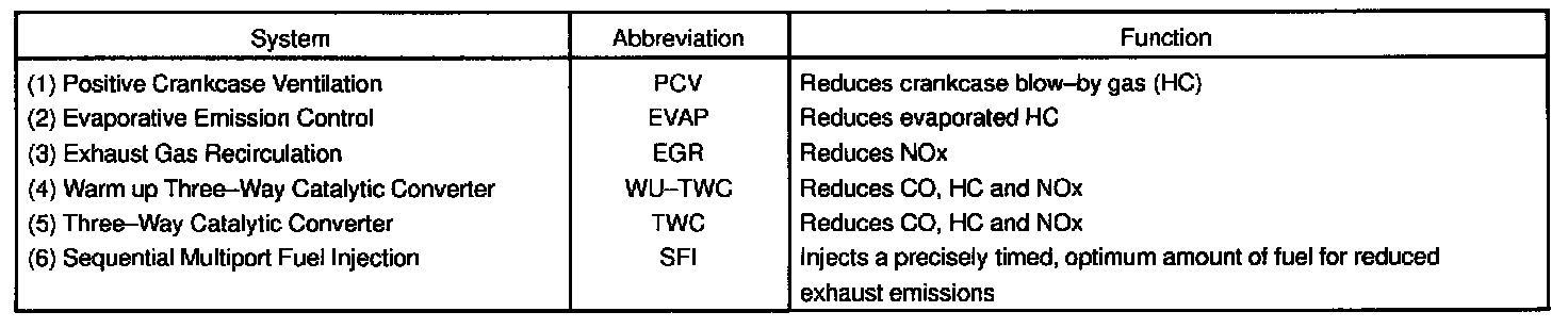 The emission control Systems are installed to reduce the amount of CO, HC and NOx exhausted from the engine ((3), (4), (5) and (6)), to prevent the atmospheric release of blow-by gas-containing HC (1) and evaporated fuel containing HC being released from the fuel tank (2).
