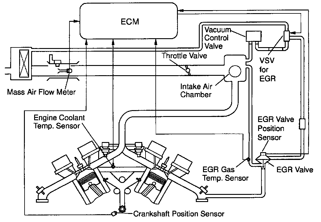 The lift amount of EGR valve is controlled by the vacuum which is regulated by the Duty-[1][2][3]VSV operated by the ECM. The lift amount of EGR valve is detected by the EGR valve position sensor which is mounted on the EGR valve and it provides feedback to the ECM to control the lift amount of EGR valve in response to engine operating conditions.