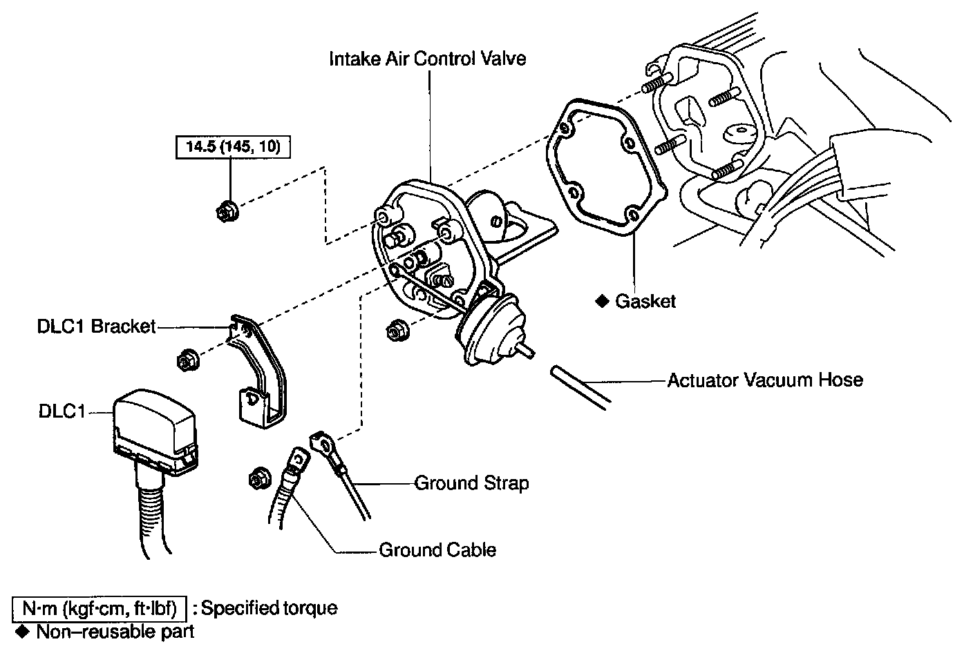 d. Install the intake air control valve, DLC1 bracket and ground strap and cable with the 4 nuts.
