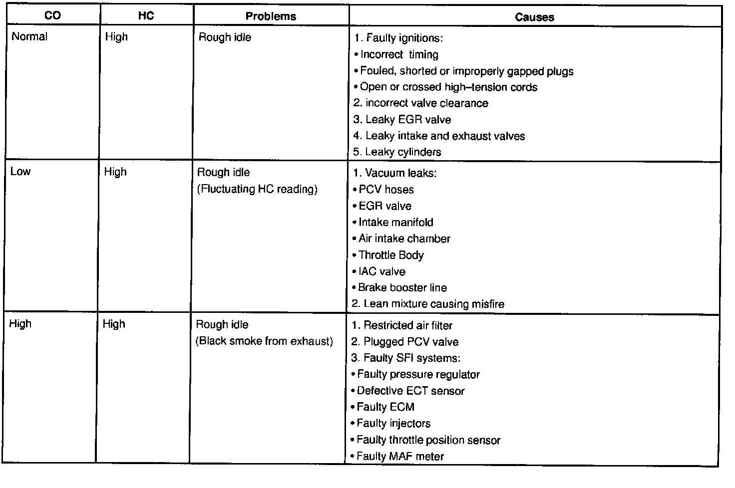If the CO/HC concentration does not comply with regulations, troubleshoot in the order given below. See the table for possible causes, and then inspect and correct the applicable causes if necessary.