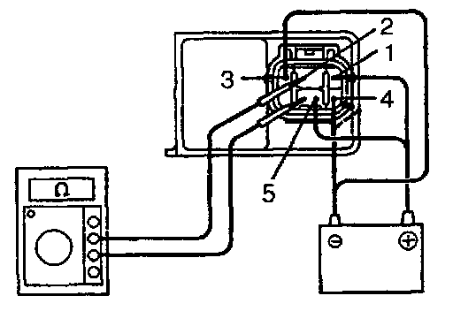 c. Connect the negative (-) lead from the battery to terminal 4, check that there is continuity between terminals 2 and 5 for 0.4 - 0.6 seconds, then there is no continuity.