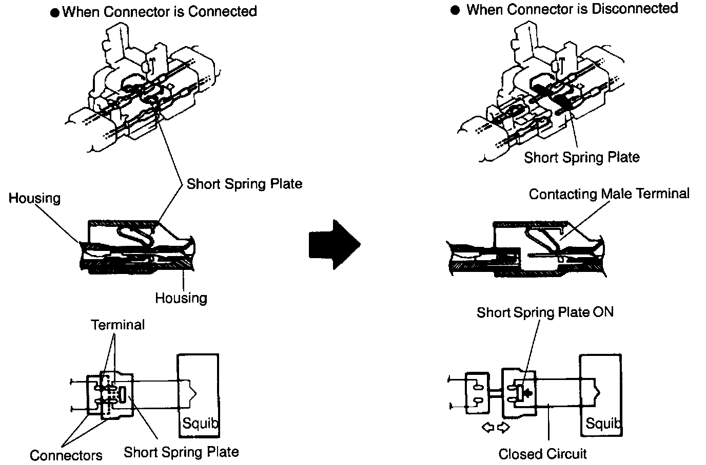 Each connector contains a short spring plate. When the connector is disconnected, the short spring plate automatically connects positive (+) terminal and negative (-) terminal of the squib.