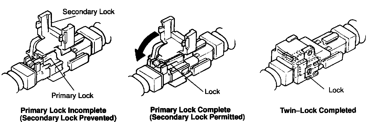 With this mechanism connectors (male and female connectors) are locked by 2 locking devices to increase the connection reliability. If the primary lock is incomplete, ribs interfere and prevent the secondary lock.