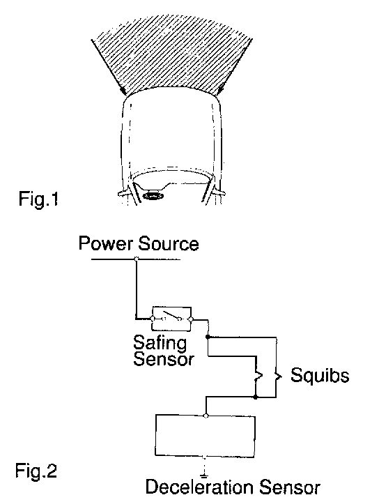 B. When the vehicle is involved in a frontal collision in the hatched area (Fig. 1) and the shock is larger than the predetermined level, the SRS is activated automatically. A safing sensor is designed to go on at a smaller deceleration rate than the airbag sensor. As illustrated in Fig. 2, ignition is caused when current flows to the squib, which happens when a safing sensor and the deceleration sensor go on simultaneously. When a deceleration force acts on the sensors, 2 squibs in the driver airbag and front passenger airbag ignite and generate gas. The gas discharging into the driver airbag and front passenger airbag rapidly increases the pressure inside the bags, breaking open the steering wheel pad and instrument panel door. Bag inflation then ends, and the bags deflate as the gas is discharged through discharge holes at the bag's rear or side.