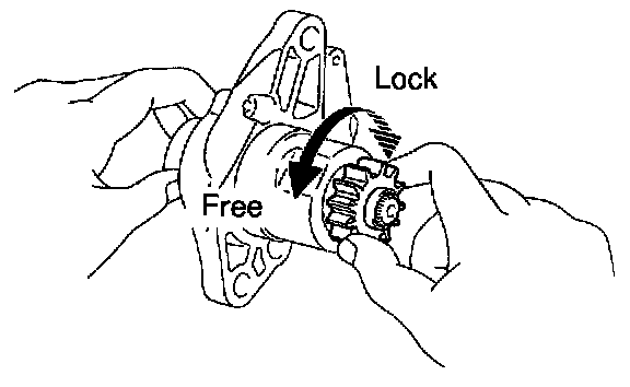 Hold the starter clutch and rotate the pinion gear counterclockwise, and check that it turns freely. Try to rotate the pinion gear clockwise and check that it locks.