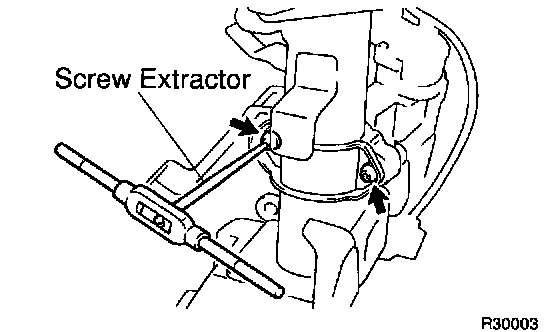 c. Using a screw extractor, remove the 2 bolts, column upper bracket and column upper clamp.