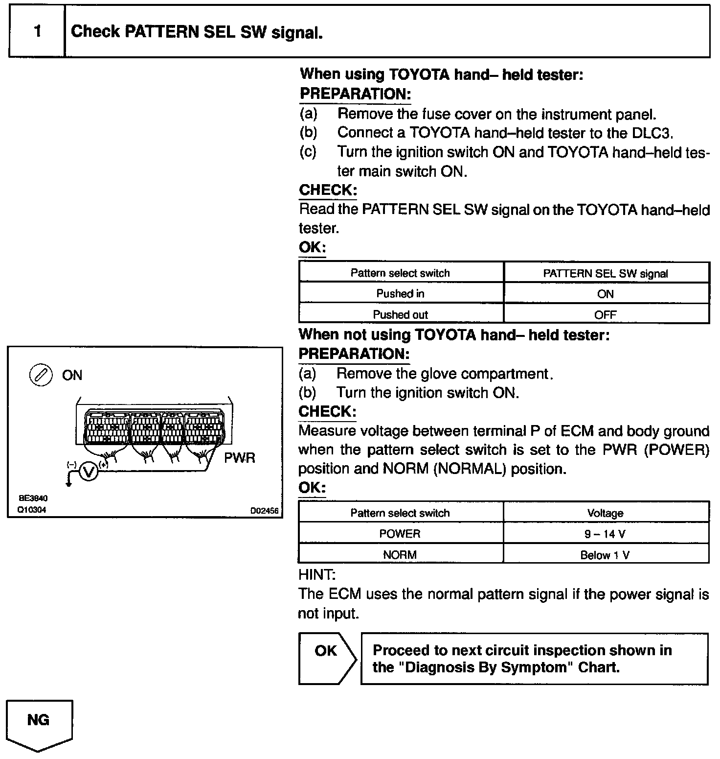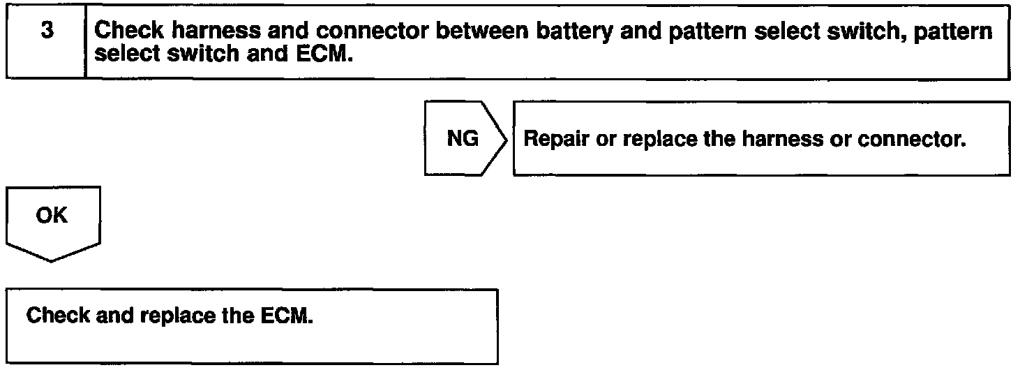 The ECM memory contains the shift programs for the NORMAL and POWER patterns, 2 position, L position and the lock-up patterns. Following the programs corresponding to the signals from the pattern select switch, the park/neutral position and other various sensors, the ECM switches the solenoid valves ON and OFF, and controls the transmission gear change and the lock-up clutch operation.