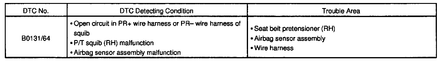 DTC B0131/64 is recorded when an open is detected in the P/T squib (RH) circuit.