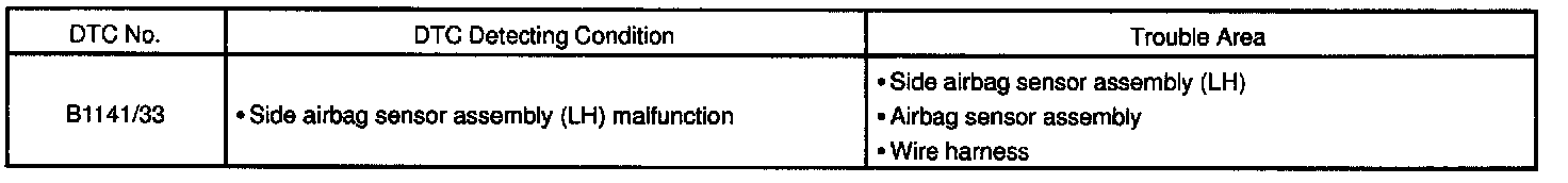 DTC B1141/33 is recorded when occurrence of a malfunction in the side airbag sensor assembly (LH) is detected.