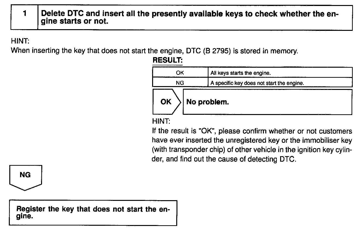 This DTC is output when an unregistered key is inserted. When this DTC is output, delete DTC and insert the key that a customer keeps to check that B2795 is output.When a key that outputs B2795 is found, register this key. when B2795 is not output, there is a possibility that the unregistered key has been inserted before. (ECM is normal.)