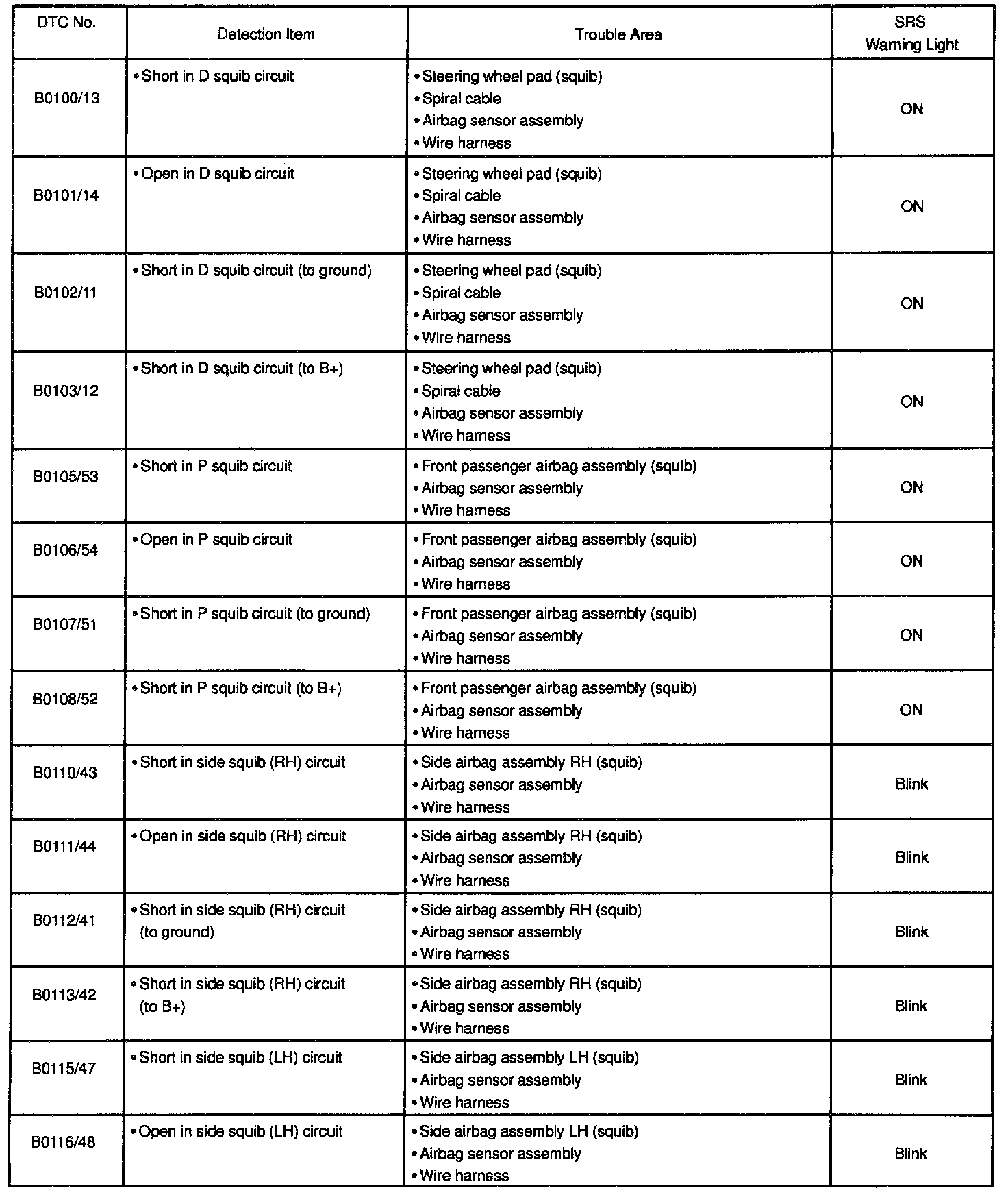 - If a code not listed on the chart is displayed, the airbag sensor assembly is faulty.